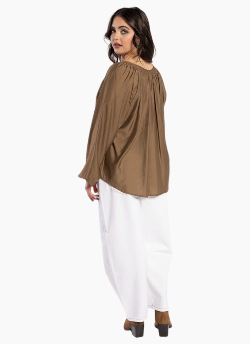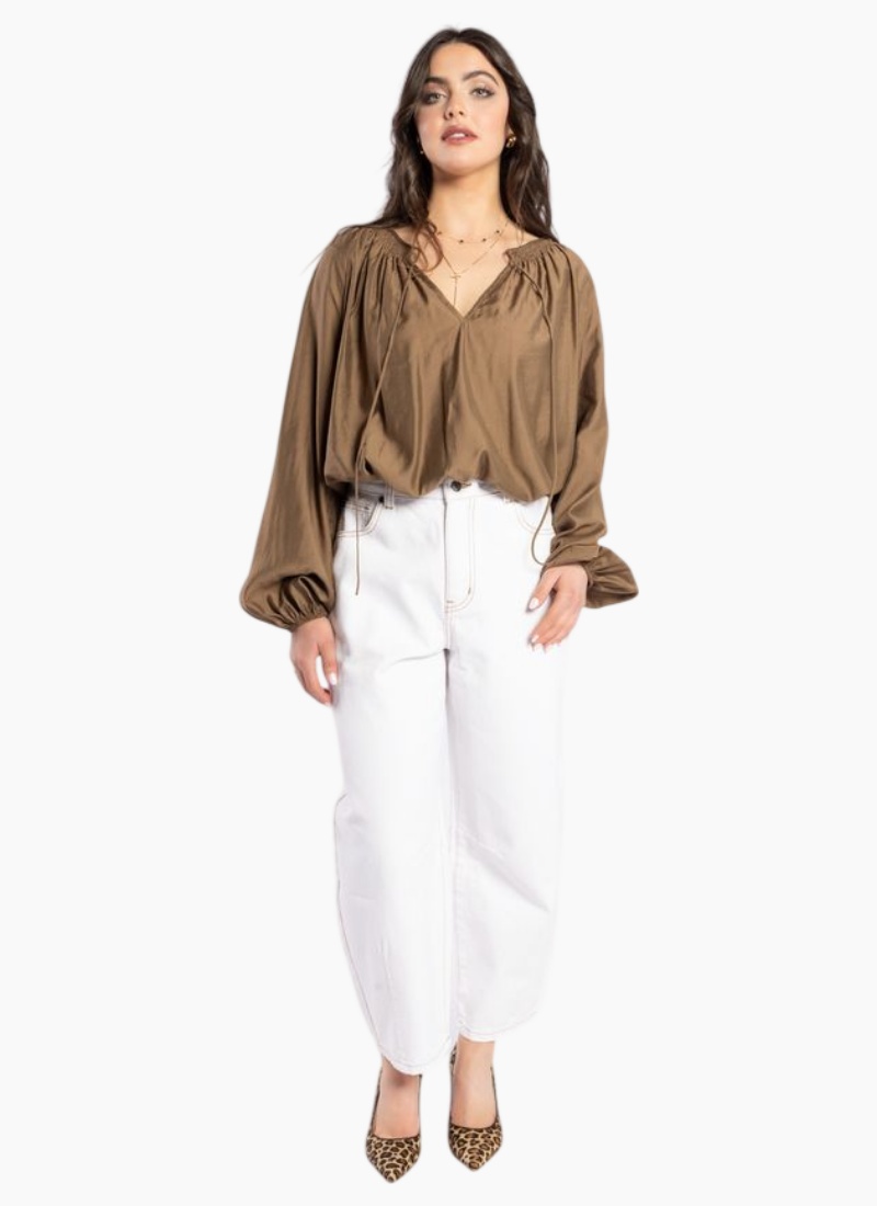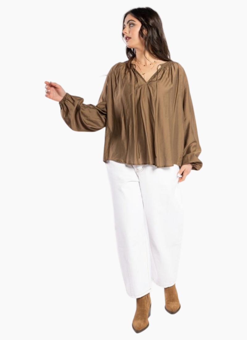 Elegant coffee-colored relaxed-fit blouse featuring intricate shirring detail around the neckline, a v-neck with tie accents, elastic cuffs, and a curved hemline. Crafted from soft Tencel polyester fabric, this versatile blouse is ideal for both dressing up and down, pairing seamlessly with a variety of drama pants, skirts, or denim.