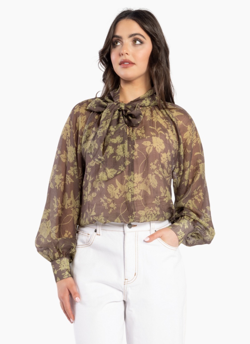 - Signature tie-neck bow and softly puffed long sleeves with buttoned cuffs for timeless elegance