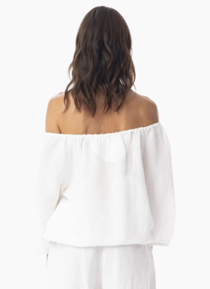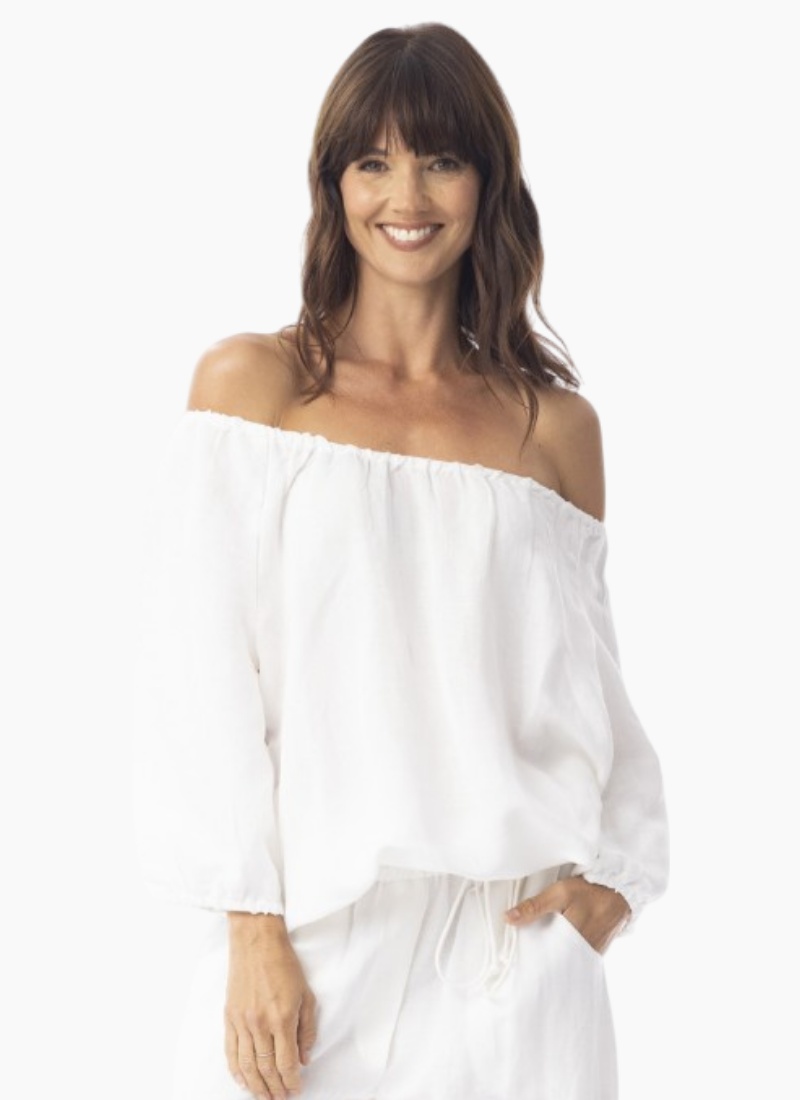 Introducing the Linen Solid Gather Top from Escape. This breezy off-the-shoulder blouse brings relaxed sophistication to warm-weather wardrobes.