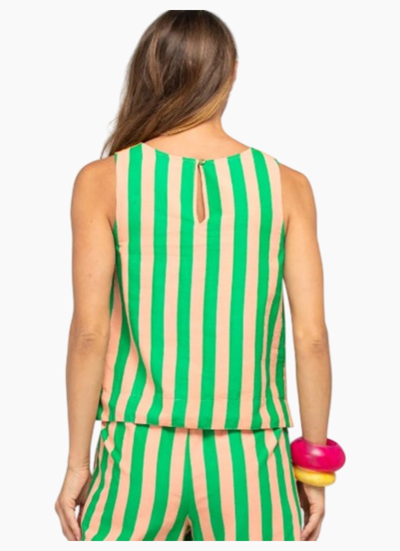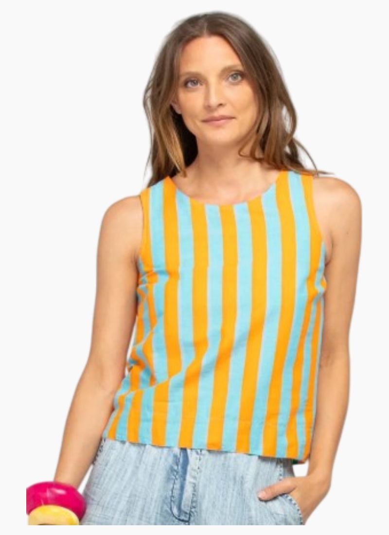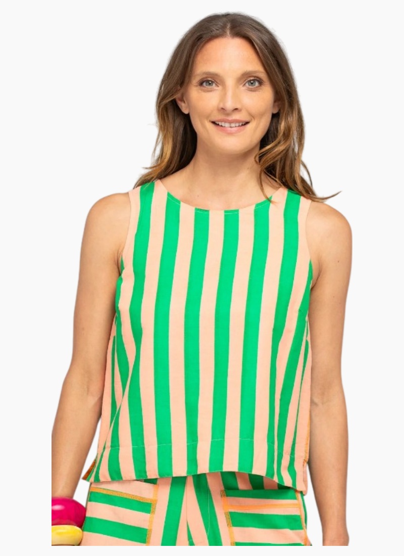 The Boom Shankar Hara Top Reversible is your new summer staple. Super fun, colourful and fully reversible with our signature Capri Peach stripe on one side and Capri Tangerine stripe on the other.100% cotton, fully reversible top with a round neck, back neck keyhole with covered button detail. Fit notes: True to size. This top has been designed to be fitted around the shoulders and bust with the hem falling straight down.